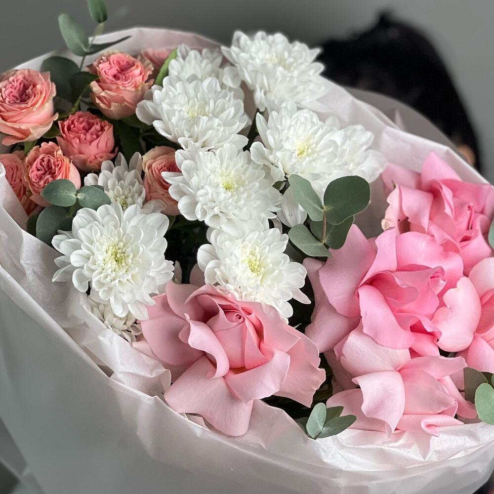 Нежный пышный букет с пионовидными розами и хризантемой в Чаплыгине